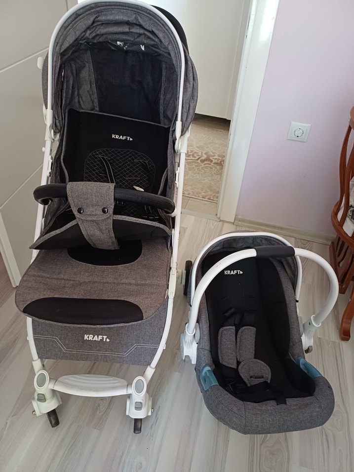 Kraft markalı gri bebek arabası, puseti ve yağmurluğu mevcuttur. Temiz kullanılmıştır. kapatılıp çanta gibi katlanabilmektedir.