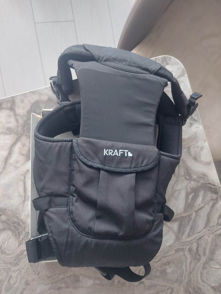 Kraft markalı siyah bebek taşıyıcı, ayarlanabilir kayışlar ve rahat taşıma için dolgulu destek sunar. "KRAFTD" logosu bulunur.