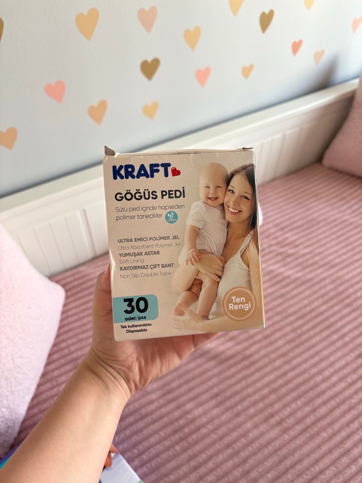 Kraft göğüs pedi, ultra emici polimer jel ve yumuşak pamuk katmanına sahip. Ten renginde, 30 adet tek kullanımlık, kaydırmaz çift bantlı