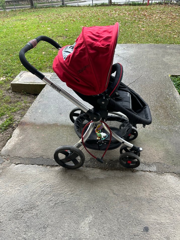 Koyu kırmızı renkli, sağlam çerçeveli büyük tekerlekli bebek arabası. Altında geniş saklama sepeti ve rahat tutma sapı bulunur. Oturma kısmı yatak olabilmekte, ayrıca oturma kısmı çıkarılarak ana kucağı monte edilebilmektedir. Arkalı önlü kolaylıkla yönü değiştirilebiliyor. İzmir içi teslime uygundur..