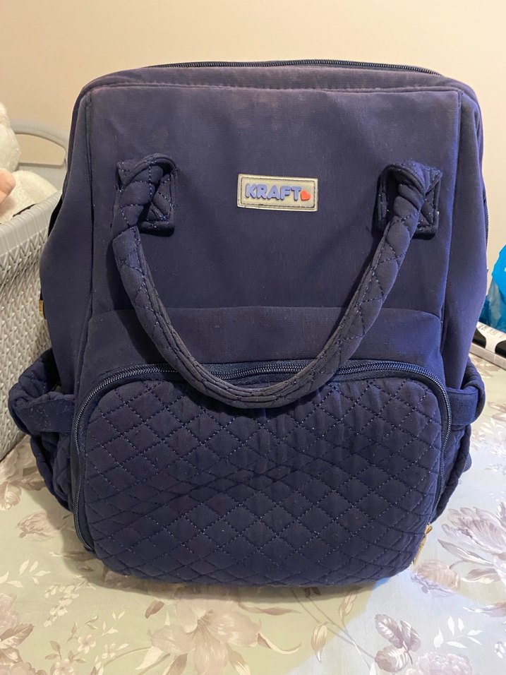 Krafto marka lacivert bebek çantası, geniş ana bölme ve ekstra depolama için kapitone ön cep içerir. Taşıması kolay sağlam saplara sahiptir.