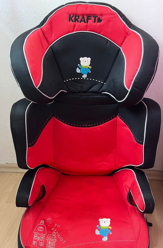 Krafto çocuk oto koltuğu, kırmızı-siyah renkli ve yumuşak kumaş kaplamalıdır, üzerinde sevimli ayı figürü bulunur. 15-36 kilo kapasiteli.yer ist.