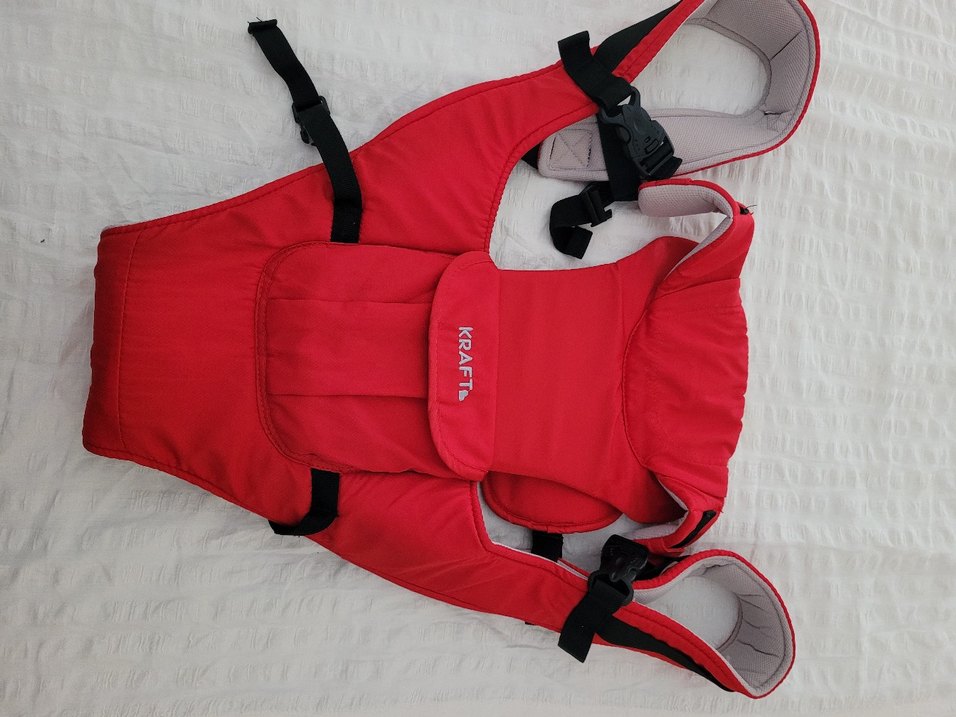 KRAFTS markalı kırmızı bebek taşıyıcı, ayarlanabilir kayışlar. ür ünde leke vs yoktur. resimde göründüğü gibi. iki şekilde kullanılıyor önde ki parça çıktğında bebeğin yönü önüne dönüyor. tek problemi bebeğin poposunun geldiği yerde ki kilitin biri açılıp kapanmıyor. Yani ben bu şekilde kullandım taşırken bir sorun olmadı bu fiyatl uygun tutuyorum.
