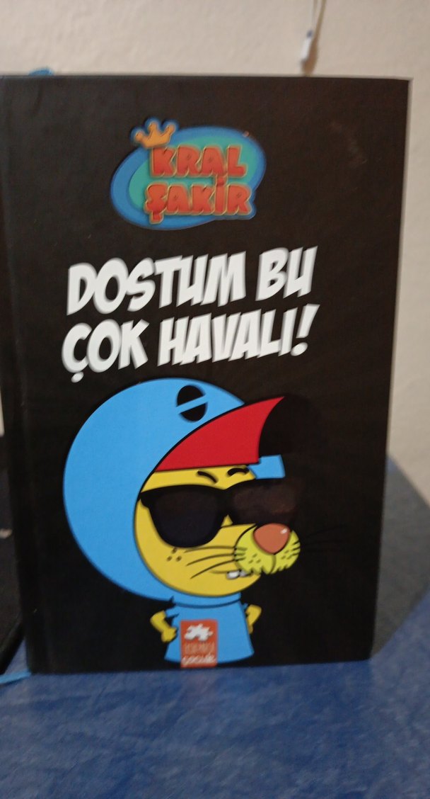 Kral Şakir karakterli, gözlük ve şapka takan renkli çizgi film figürlü çocuk kitabı.