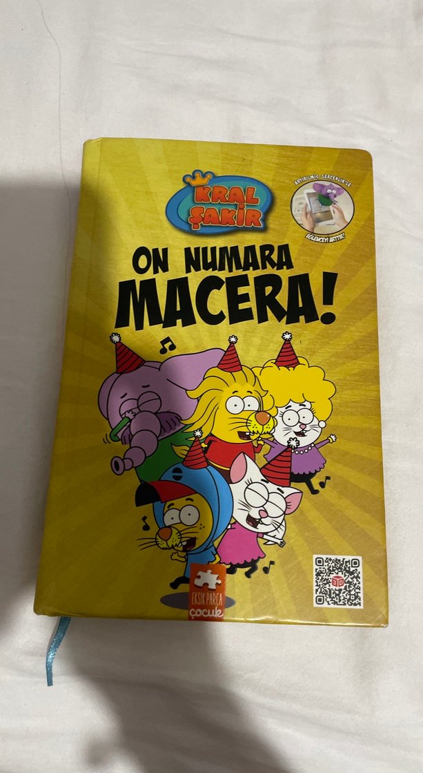 Kral Şakir On Numara Macera çocuk kitabı, renkli karakterler ve macera dolu hikayeler içerir. Etkileşimli özellikler ve ekstra içerik için QR kodu bulunur.