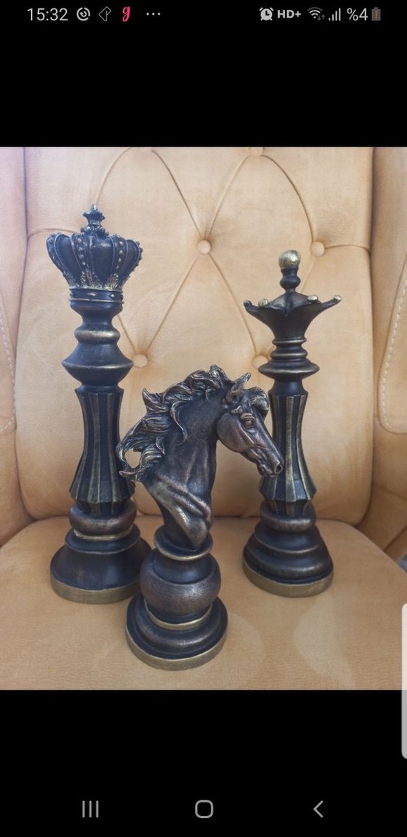 Kral, vezir ve at figürlerinden oluşan koyu renkli set, altın detaylarla süslenmiş ve zarif bir tasarıma sahip. ♟️
