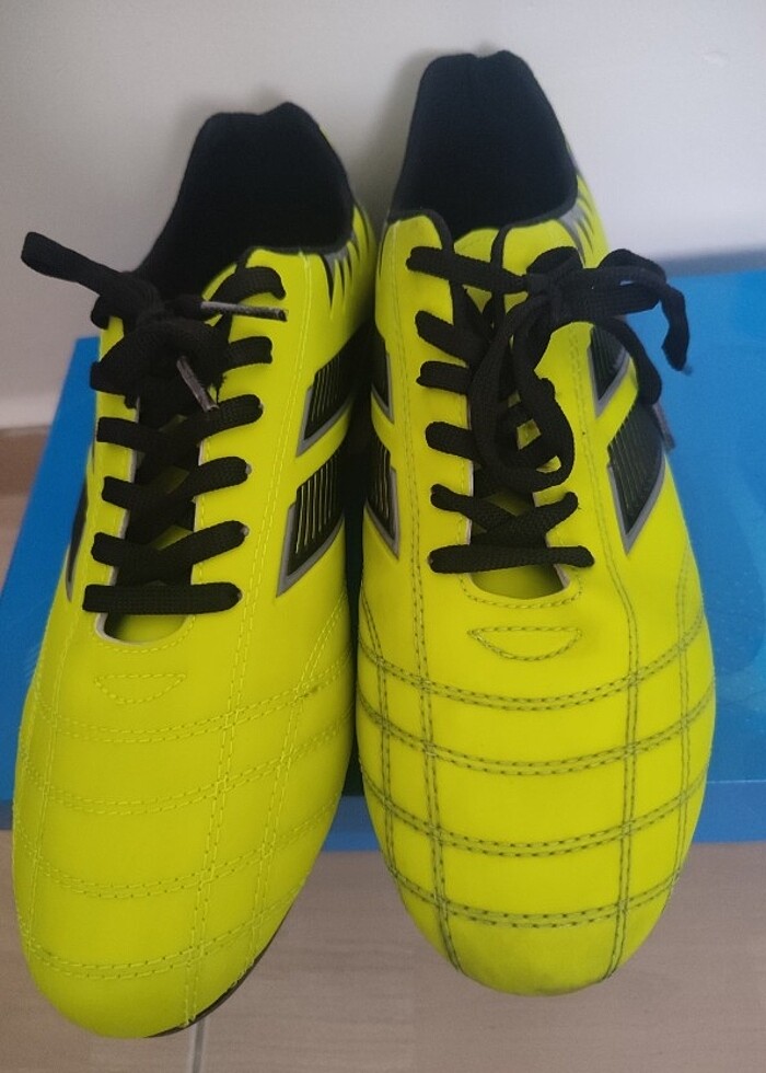 neon yeşili siyah detaylı 42 numara krampon. hiç giyilmedi. sorunuz varsa yazabilirsiniz çok anlamadığım için böyle fotoğrafladım :) #maç #halısaha #krampon #futbol