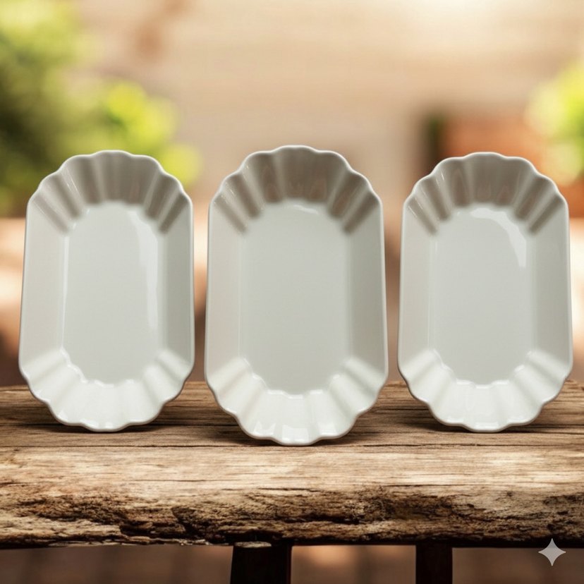Kenarları dalgalı. krem rengi dekoratif servis tabakları seti, yemek sunumuna şıklık katar. ️