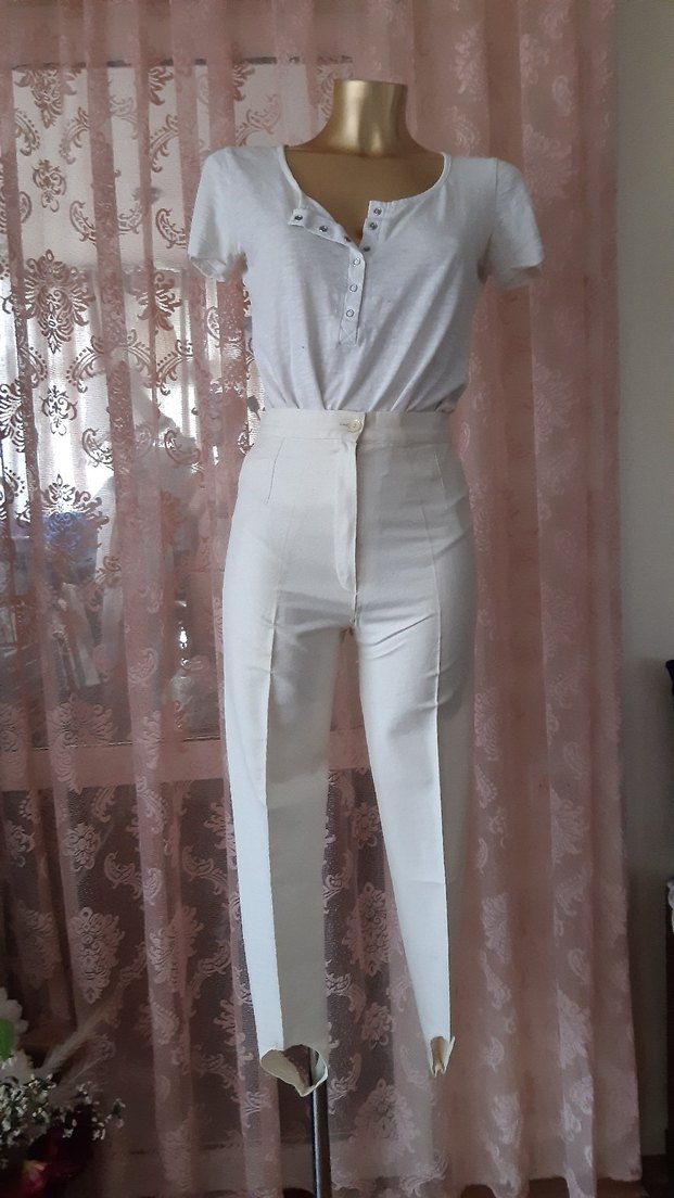 Krem rengi, likralı, oldukça esnek, kumaş pantolon. Hafif parlak keten gibi duran ipeksi dokusu var. Binici pantolonu gibi ayak altından geçmeli çizme ve botla çok şık duruyor. 36 ve 38 bedenlere uygun. Hiç giyilmedi. #pantolon #krempantolon #likralıpantolon #binicipantolonu #kadınpantolon