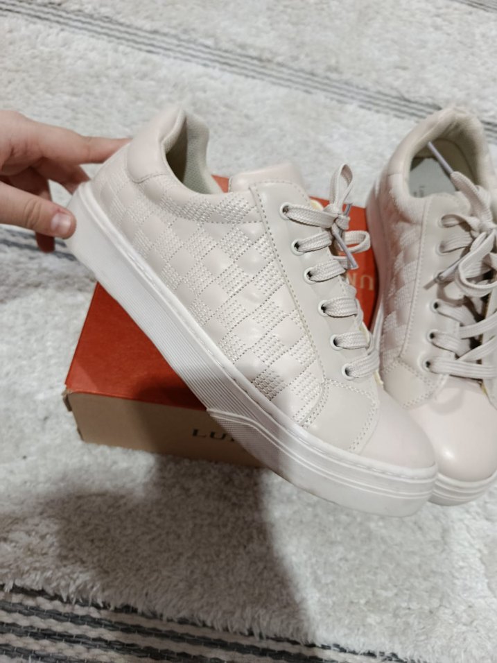 Krem renkte, bağcıklı tasarıma sahip kadın spor ayakkabısı. Düz ve desen içermeyen yüzeyiyle günlük kullanıma uygundur.