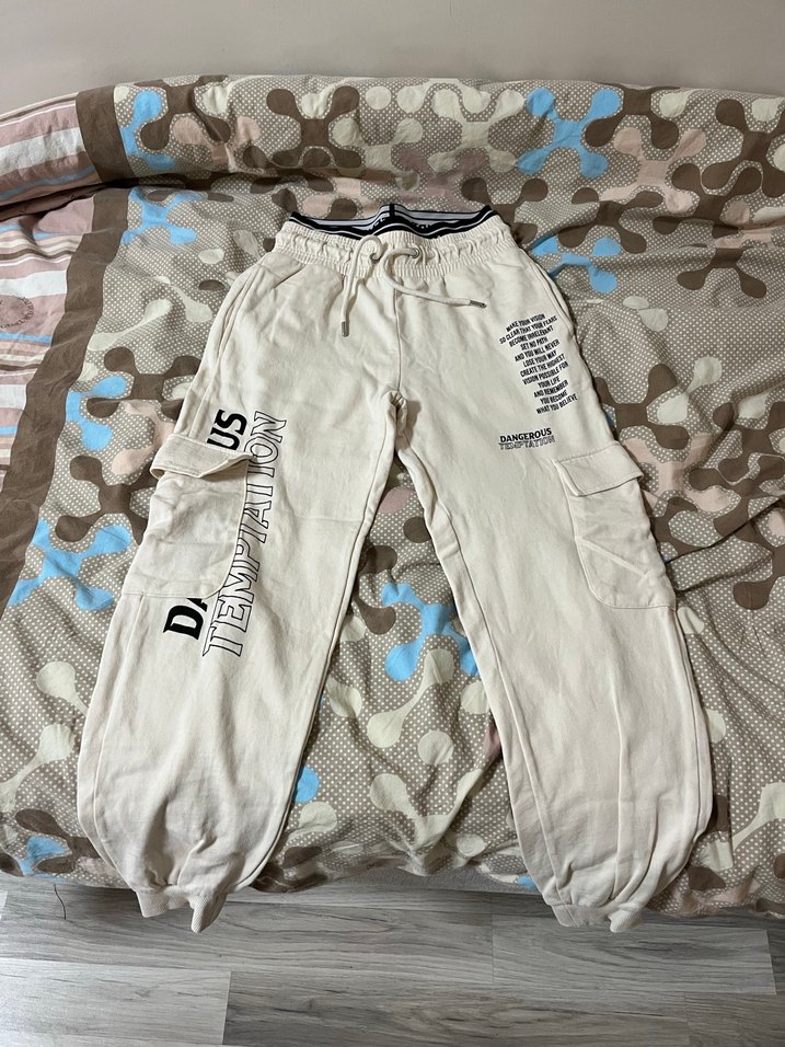 Baskılı yazılı detaylara sahip, pamuklu beyaz rahat kesim kadın eşofman, midi uzunlukta ve çok cepli, günlük kullanıma uygun paçası lastikli 60 kiloya kadar olur beli hem lastikli hem ipli kargo cep eşofman sorunsuz sayılı giyildi