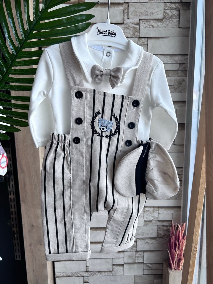 Pamuklu malzemeden yapılmış, düğmeli beyaz gömlek ve zebra desenli krem çizgili askılı tulumdan oluşan bebek takımı. %100 pamuktur. 0-3’den 9-12 aya kadar beden seçeneği mevcuttur.