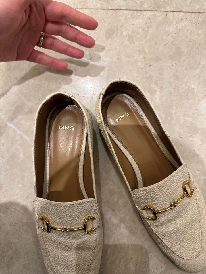 Krem bej deri, parlak yüzeyli, tokalı ve blok topuklu kadın loafer ayakkabı. Minimalist ve desensiz tasarımıyla günlük kullanım için uygundur.