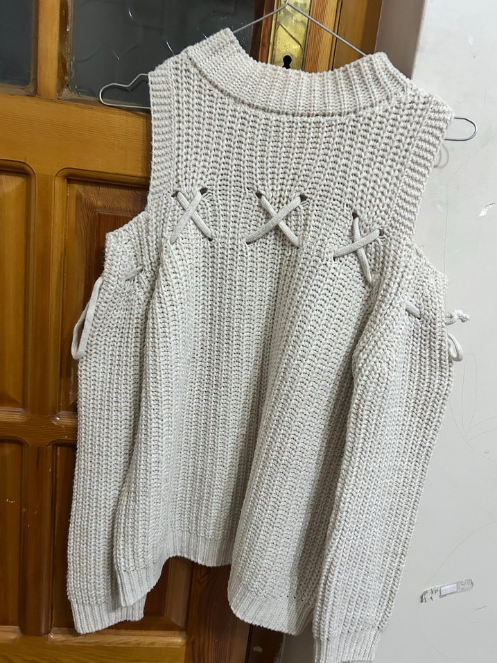 Krem bej arası yüksek yakalı kazak. Bol kesim ve midi boy, günlük kullanıma uygun.