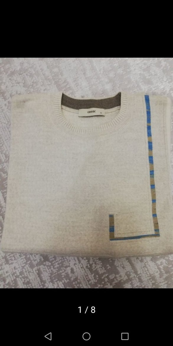 Krem-beyaz renkli, yuvarlak yaka ve uzun kollu triko erkek kazak. Düzenli kesim, kısa boy ve sade mavi-kahverengi geometrik detay içerir.