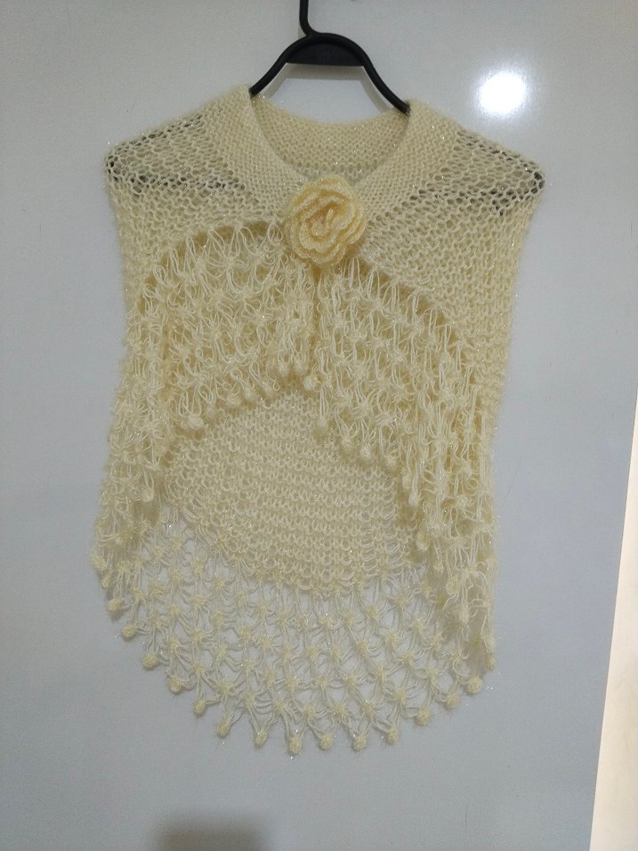 Kız çocukları veya yetişkin için Krem , örgü bohem bolero. Askısız, kolsuz ve üzerine oturan kesimdir. Çiçek detaylıdır.