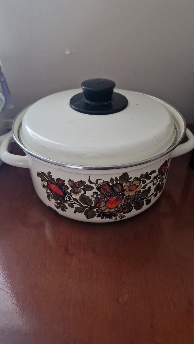 krem çiçek desenli kapaklı emaye tencere