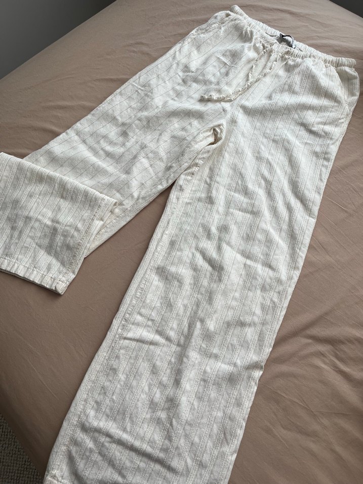 2 kere giyildi, keten kumaştan, krem ince çizgili, bol kesim kadın pantolon. Günlük kullanıma uygun, rahat ve bohem tarzda bir model.