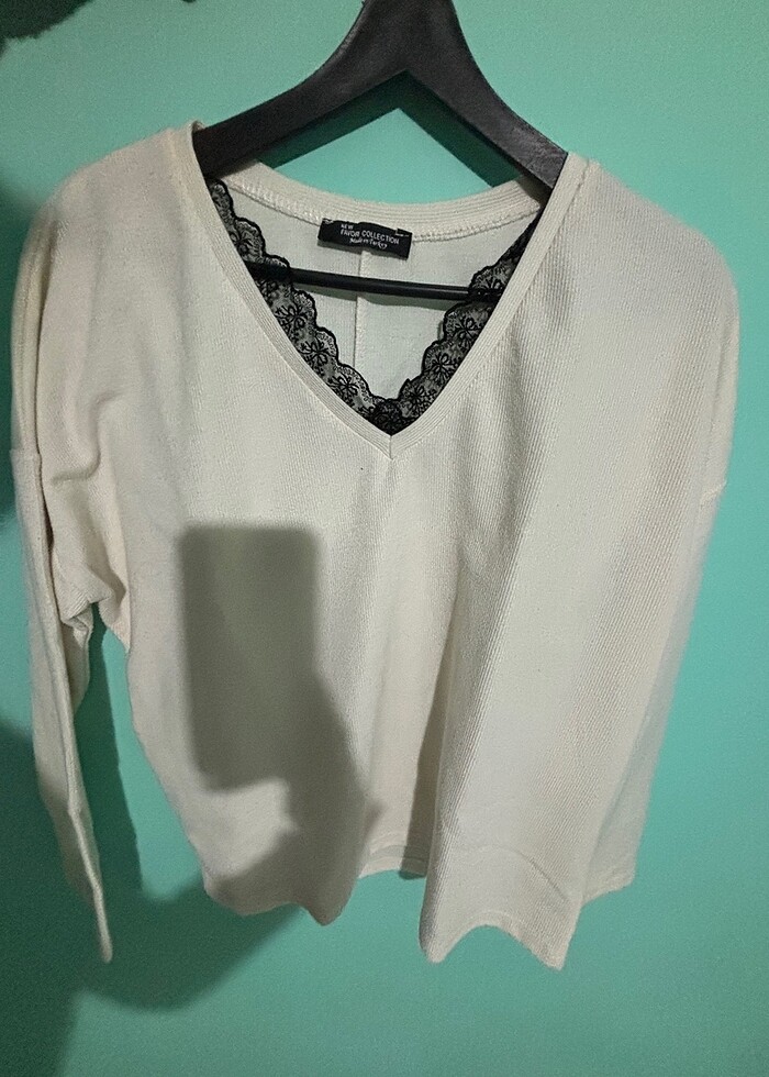 Krem rengi siyah dantel detaylı şık bluz. Birkaç kez giydim. Standart beden, L bedene kadar olur. Benim gibi bol sevenler için s/m beden daha iyi olacaktır