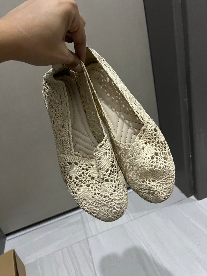 Krem dantel detaylı, örgü kumaştan yapılmış espadril. Minimalist bohem tarzında, günlük kullanım için uygundur.