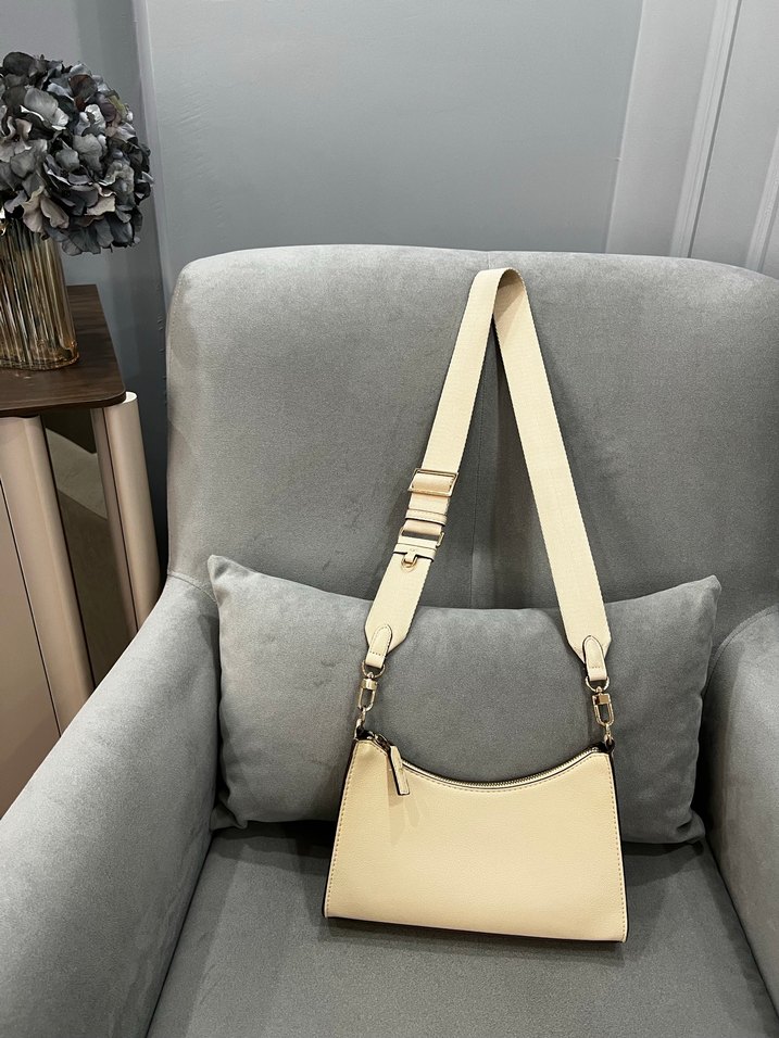 Krem deri kadın omuz çantası, tokalı ayarlanabilir seyyar askıya sahip. Orijinal. Fermuarında ufacık bir soyulması var.