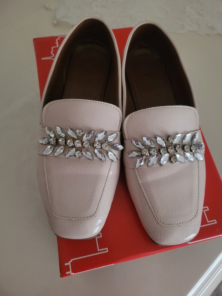 Krem deri, taş işlemeli kadın düz ayakkabı. Düğünler için çağdaş tasarım ve klasik zarafeti bir arada sunar.