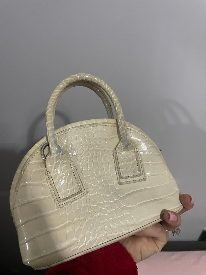 Krem deri ve yılan desenli, tokalı saplara sahip kadın çanta, trend sokak stili için uygun. İçersinde zincir var. Çok kullanılmadı ama giydiğim bir kıyafetin rengi çıkmış.