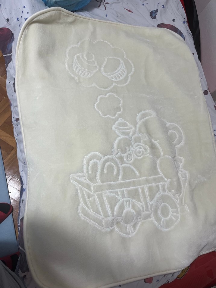 Krem renkte, oyuncak ve araba desenli kabartmalı yumuşak ve sıcak bebek battaniyesi. Çocuklar için rahat ve nazik.