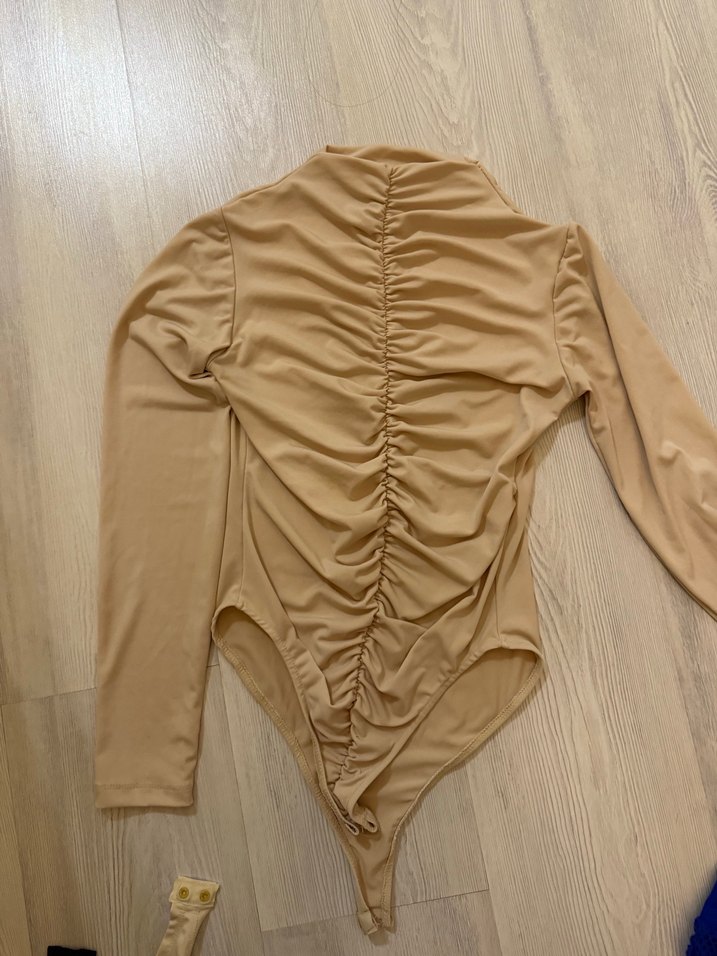 Krem renkli, uzun kollu, yüksek yakalı ve drapeli detaylara sahip, vücuda oturan kadın bluz. Hazel anma markası 1 kez giyildi