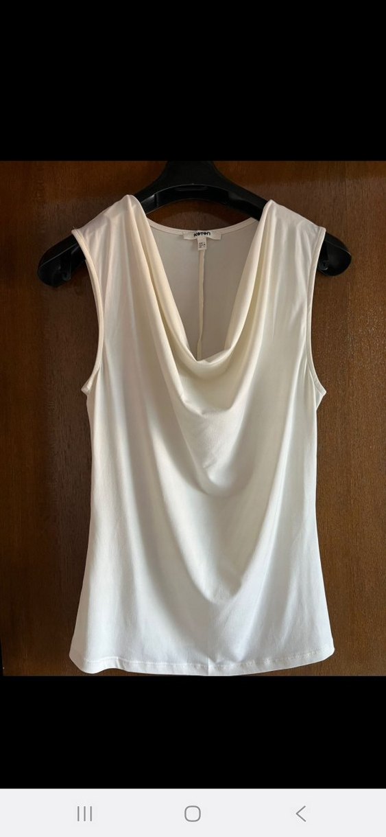 Kolsuz krem bluz, drapeli V yakaya ve vücuda oturan kesime sahiptir. İpeksi kumaştan yapılmış, hafif ve düz günlük kullanım için uygundur.