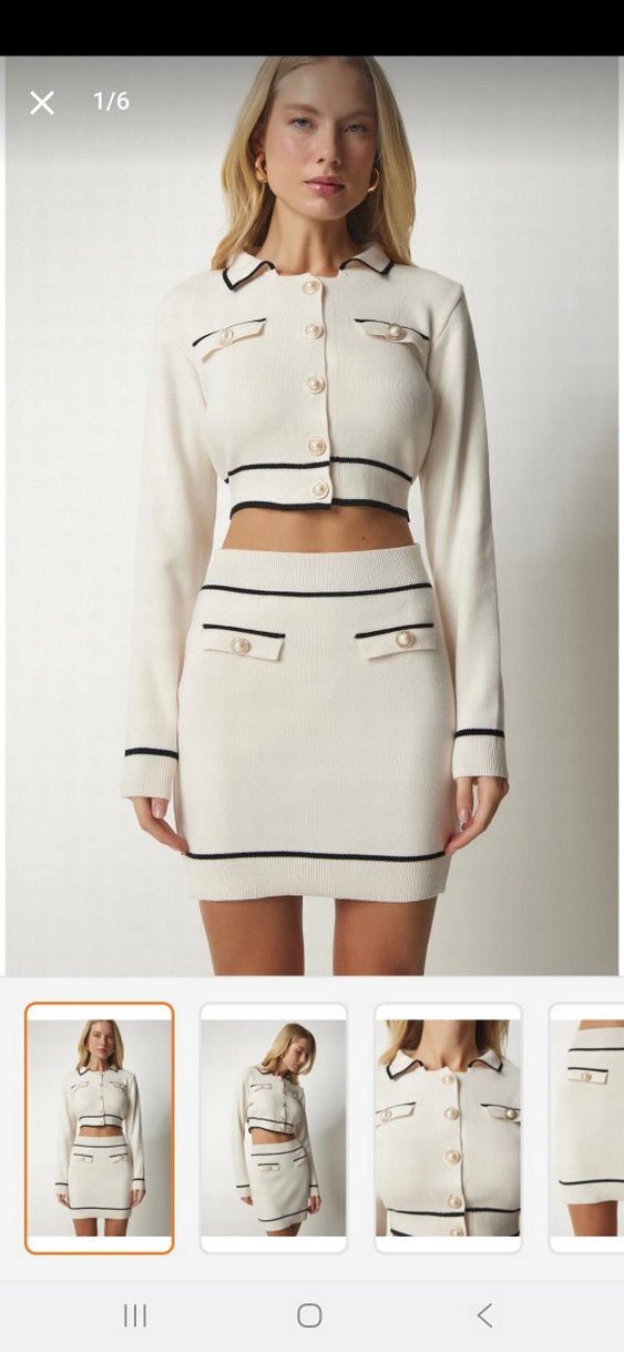 Krem düğme detaylı triko hırka etek takımı, az kullanılmış, uzun kollu, çok iyi durumda. S/M beden. Ustümdeki duruşunu da ekliyorum, kilom 59 kg, boy 170 cm.