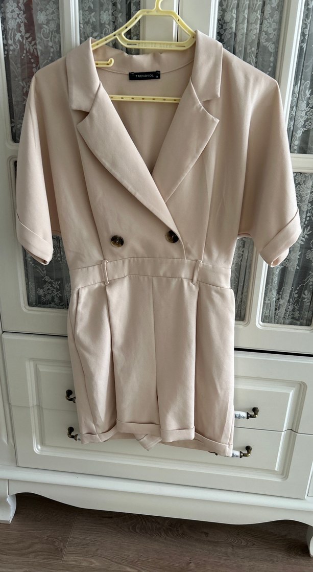 Krem renkte, düğmeli . Şort Tulum. Kemeri mevcuttur.