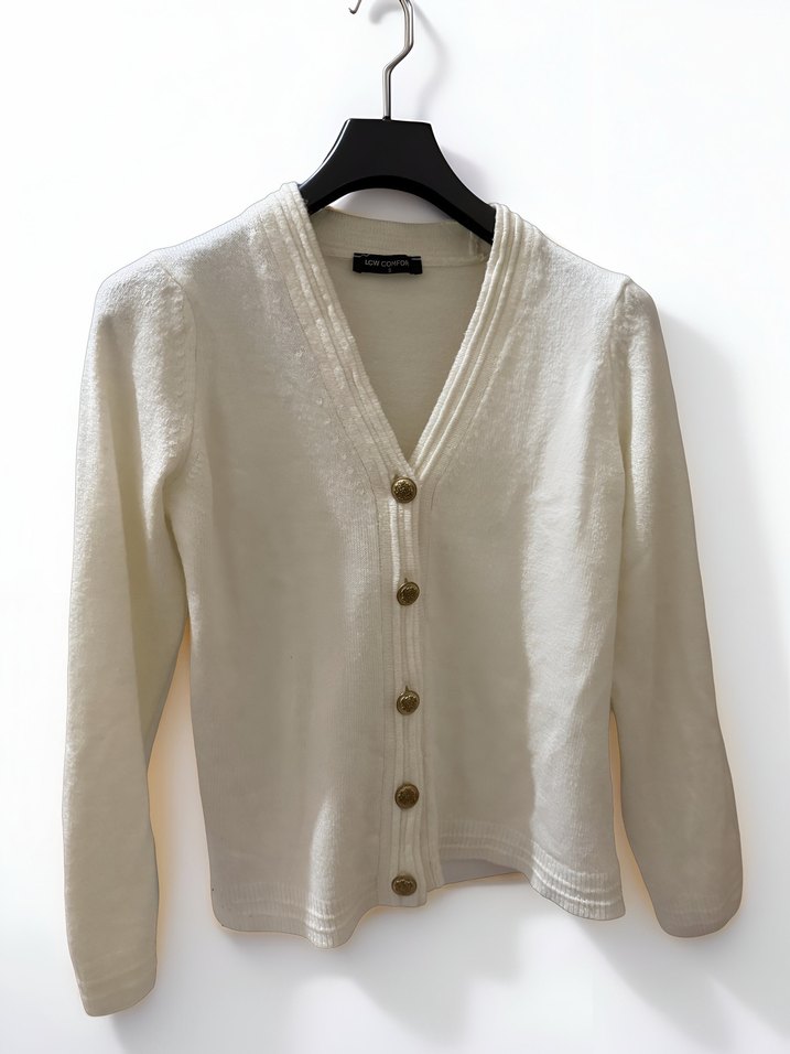 Krem uzun kollu, V yakalı ve düğmeli, modern klasik tarzda bir hırka.