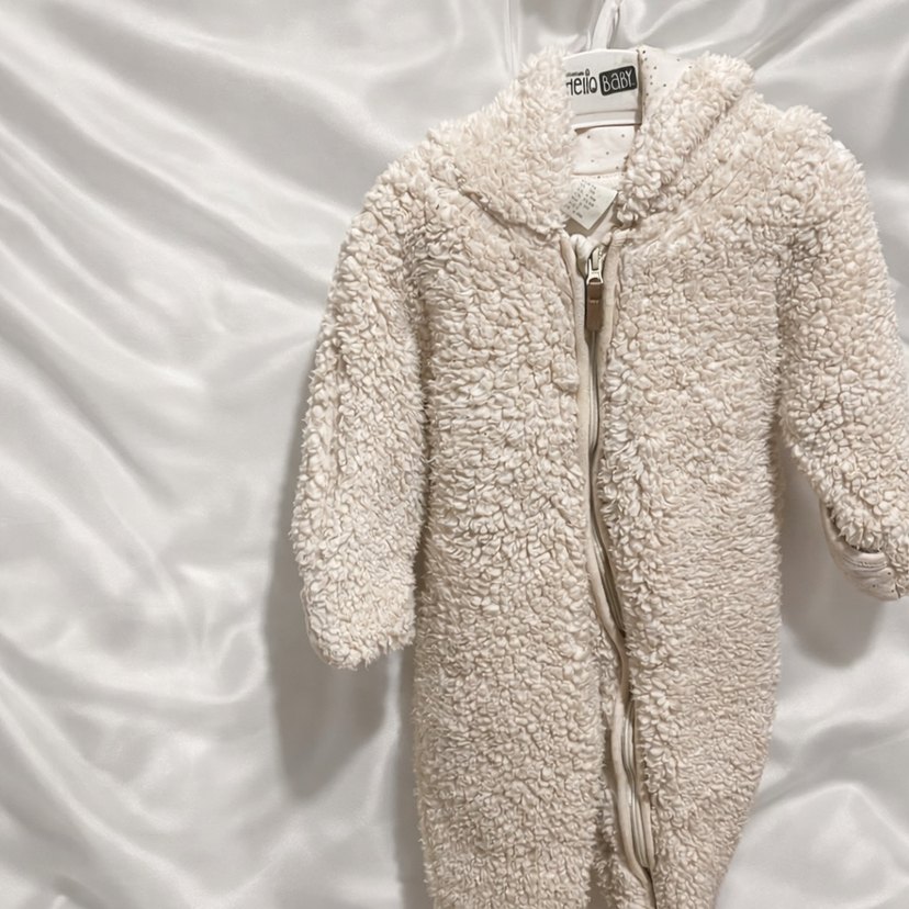 Krem renkte, yumuşak peluş kumaştan yapılmış, kürk detaylı ve ön fermuarlı bebek tulumu. Desensiz ve sade normcore tarzında. ❄️ patiklidir. Elleri açılabilir eldivendir. Krem rengindedir. İlk fotoğrafı baz alınız. Bazıları ışıktan beyaz çıkmış. 6-9 ay bedendir.