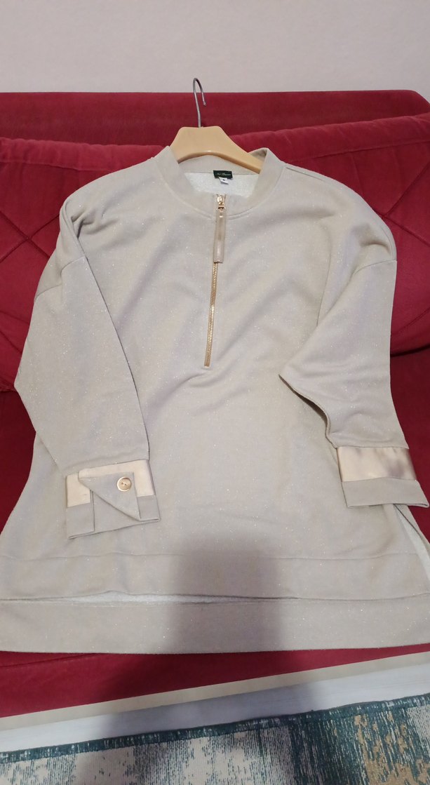 Kremrenkli, uzun kollu, yuvarlak yaka kadın sweatshirtü. Önünde fermuar ve düğmeli manşet detayları bulunur. kendinden simli Rahat kesimi ve yumuşak kumaşıyla günlük kullanıma uygundur.