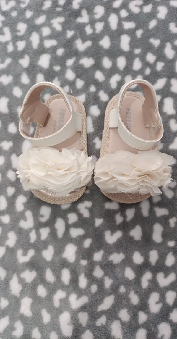 Krem, kauçuk malzemeden yapılmış, ön kısmında fırfır detaylı, çiçek desenli bohem tarzı kız çocuk sandaletleri.