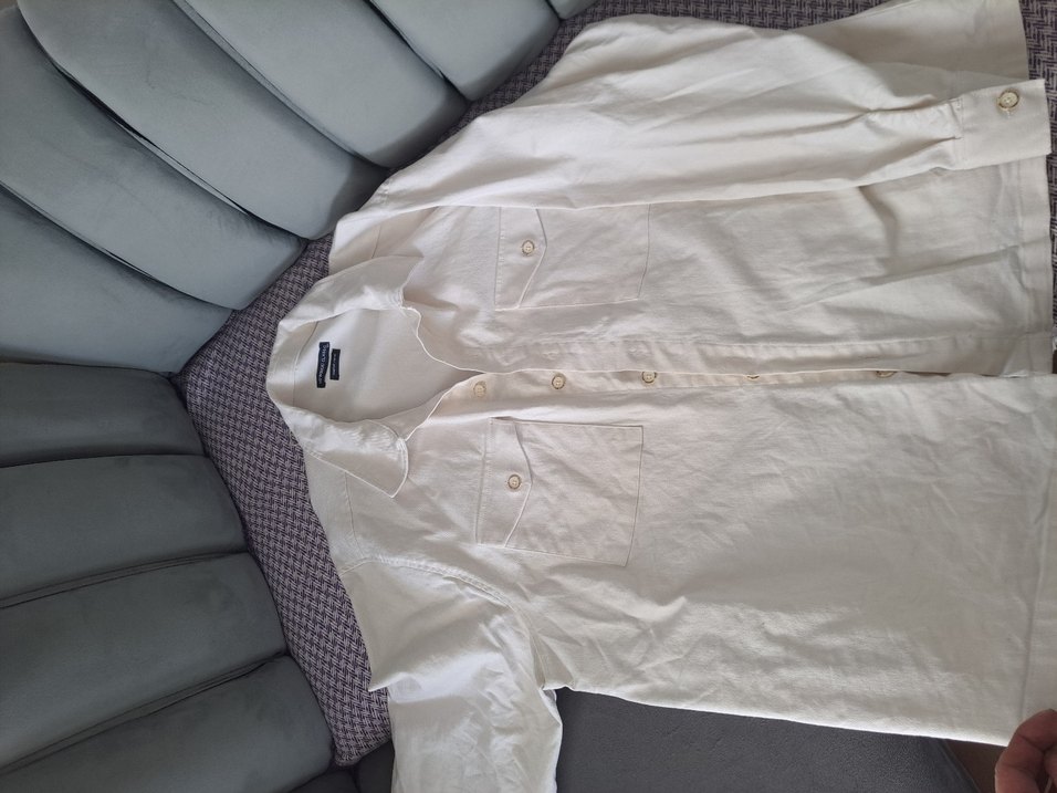 Düğmeli ön cep detaylı, gabardin kumaştan yapılmış uzun kollu beyaz erkek gömleği. Normal uzunlukta, regular fit ve notched lapel yakaya sahip, günlük sokak stiline uygun.