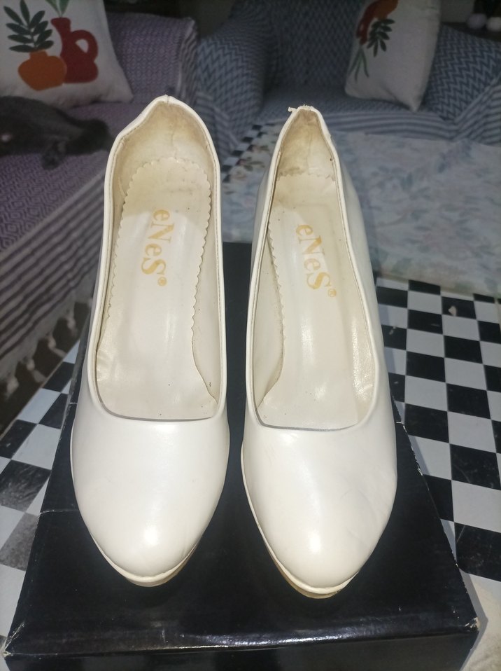 Krem parlak yüzeyli, sade tasarımlı ve klasik stile sahip stiletto topuklu kadın ayakkabısı. sadece düğünümde giydim Marka: eNeS.
