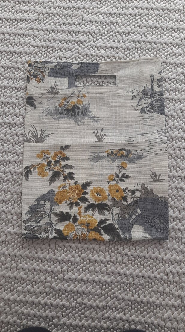krem Gri renkli, tekstil (panama keteni) malzemeden yapılmış, desenli kadın el çantasi. Günlük kullanım için uygun, vintage havası taşıyor. 30×39×8 olculerinde