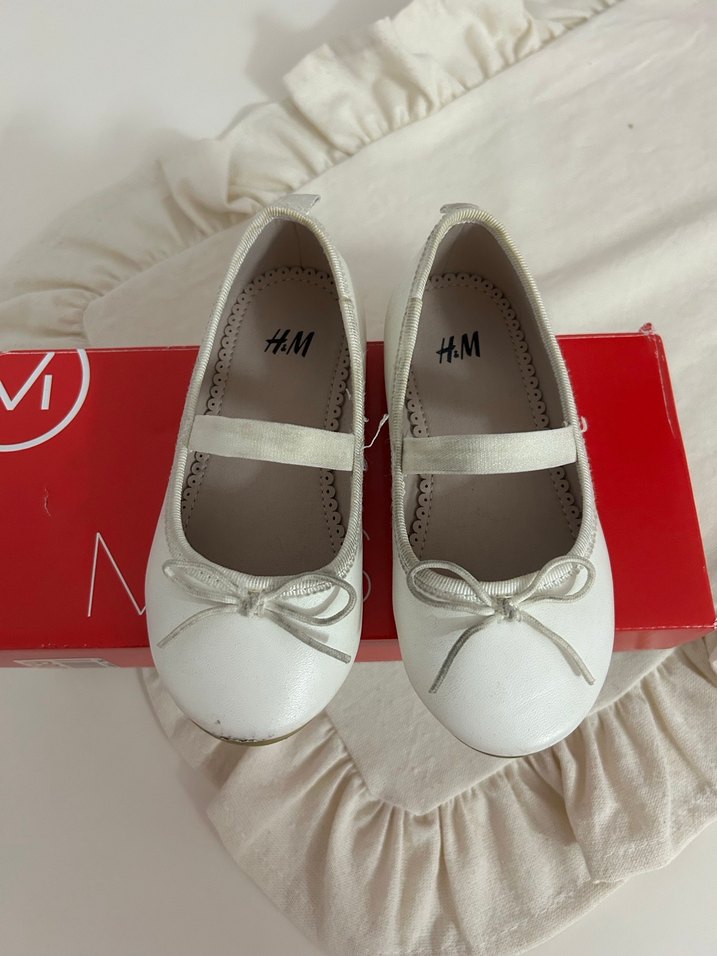H&M markalı beyaz kız çocuk babet ayakkabı, fiyonklu ve kauçuk tabanlı, modern klasik stile sahip, desensiz ve açık renkte. Ürünün önünde hafif bir soyulma var fotoğrafta kusurları belli oluyor zaten onun için fiyatı uygun tuttum
