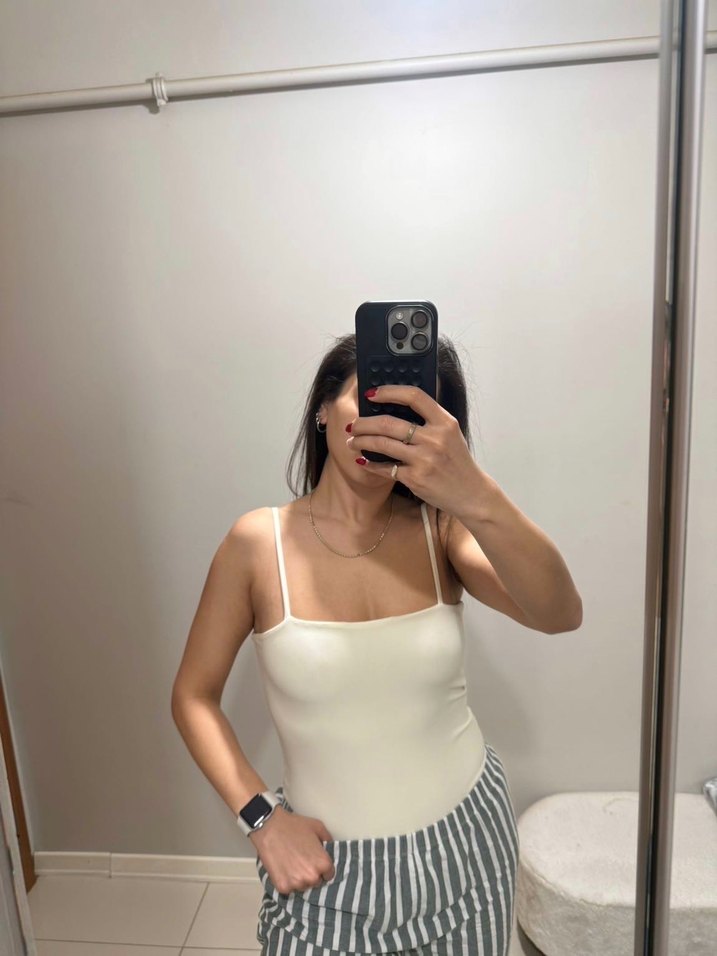 Esnek kumaşlı likralı l beden krem rengi bodysuit. Bir kere giydim, kumaşı çok rahat. Askılarını kendi vücudunuza göre ayarlayabilirsiniz.