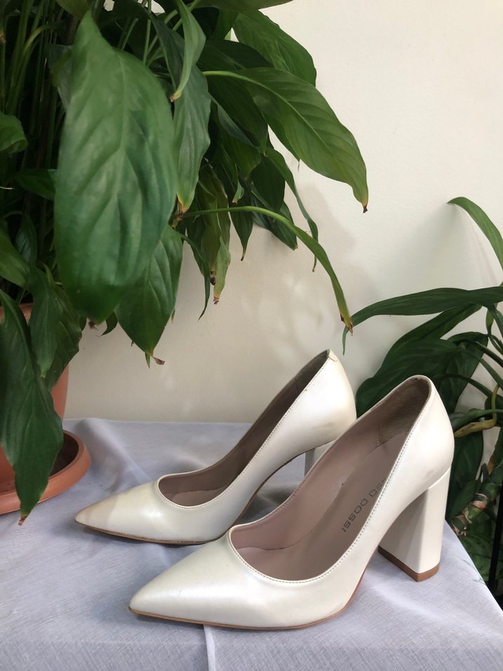 Beyaz, blok topuklu kadın stiletto. İpek gibi dokusu ve modern klasik tasarımıyla düğünler için şık ve zarif bir seçim. Desensiz ve hafif görünüm sunar.