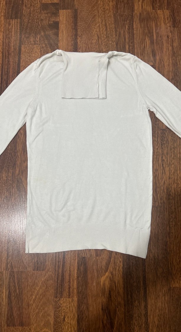 Krem renkli, keten kumaştan yapılmış, boğazlı yaka ve uzun kollu kadın kazak. Normal kesim ve midi boyda, günlük kullanıma uygun minimal tarzda.