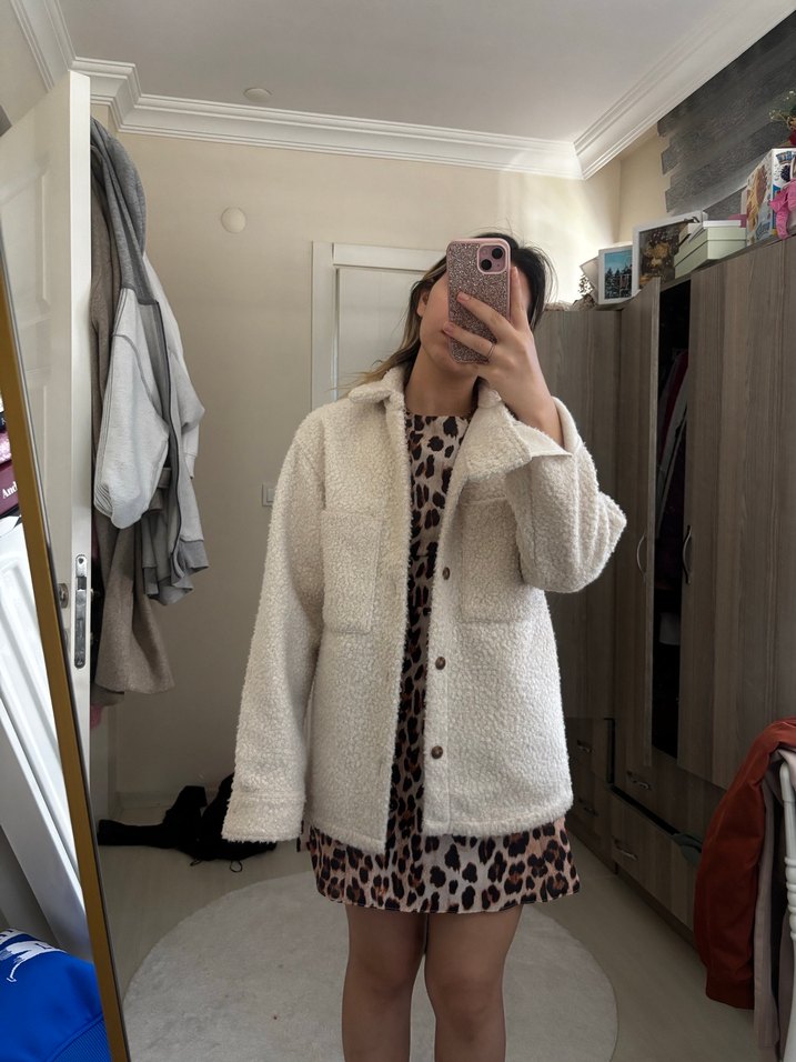 Bol kesim, krem renkli, midi ceket. Yumuşak ve sıcak kumaştan, günlük kullanım için uygun. Uzun kollu, sokak tarzı ceket.