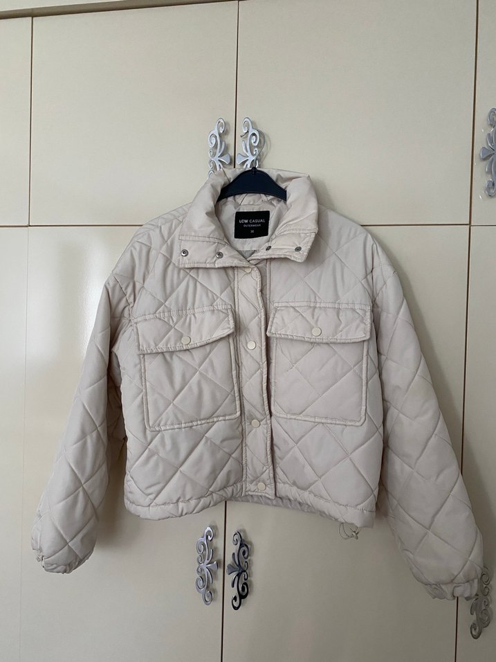 Bej renkte, kısa kesim kadın ceketi, düğmeli ve yakalıdır. Bol kesim, uzun kollu ve iki ön cep içerir. Yumuşak ve sıcak kumaştandır. Rahat sokak stili için uygundur.