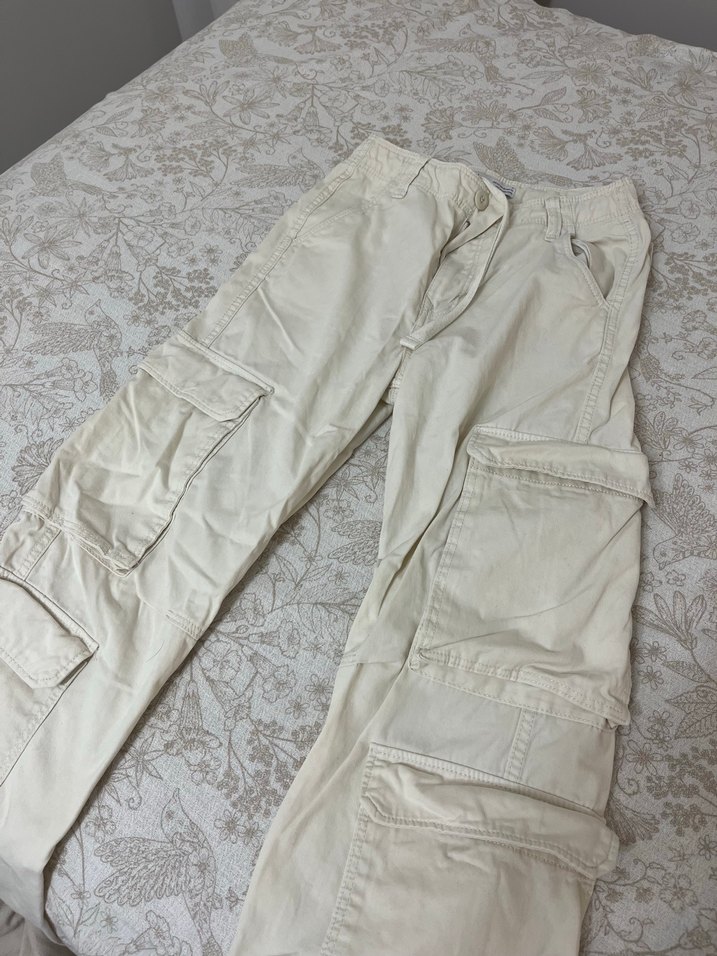 çoklu cepli beyaz krem bol kesim kadın pantolon, gündelik rahatlık için sokak stiliyle tasarlandı.