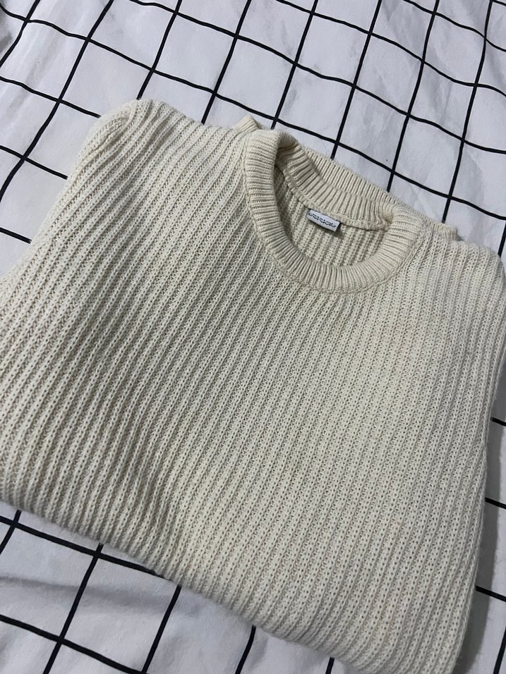 Krem renkte, kazak örgü dokusuna sahip, yuvarlak yaka ve uzun kollu kadın triko kazak. Günlük kullanıma uygun, sade ve rahat bir modeldir.