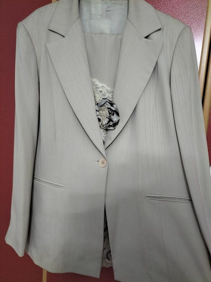 Gri, uzun kollu, düğmeli ve satenimsi dokulu blazer ceket. Ofis için modern klasik tarzda, regular fit ve kesikli yakaya sahip. ceketi 44 beden pantolonu 46 bendendir