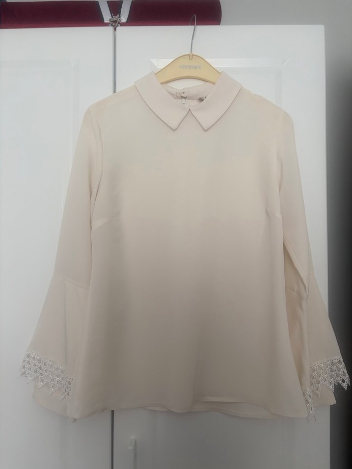 Krem renkli, uzun kollu, yakalı ve düğmeli kadın gömleği. Kollarında dantel detayları ve bol kesimi ile ofis kullanımı için uygundur. Marka temsili 1 defa giyildi