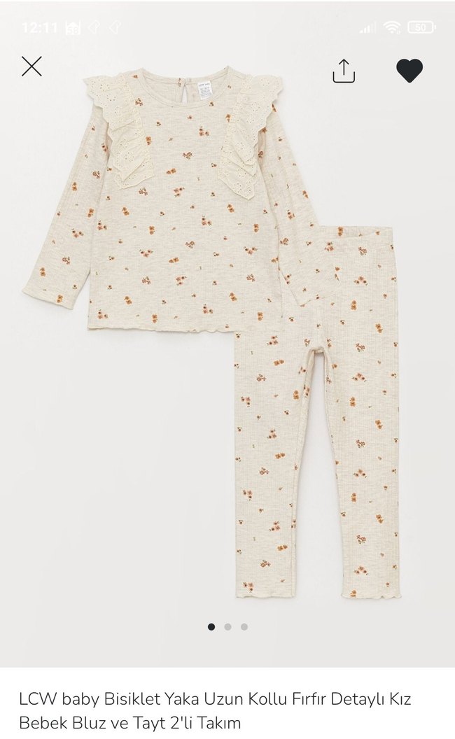 Uzun kollu, krem kahve Çiçekli renkli, küçük desenli ve dantelli detaylı bebek kız takımı. Yumuşak ve rahat kumaştan üretilmiştir.